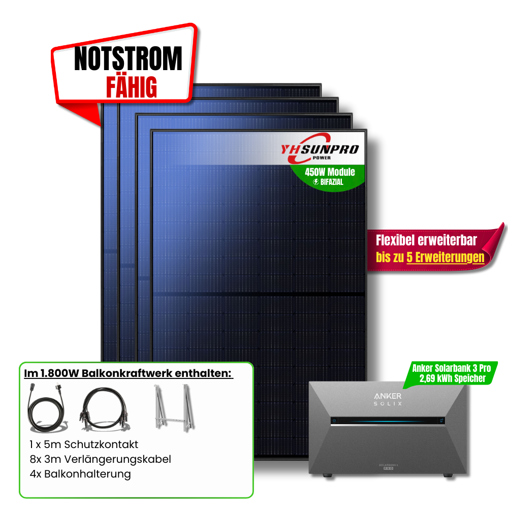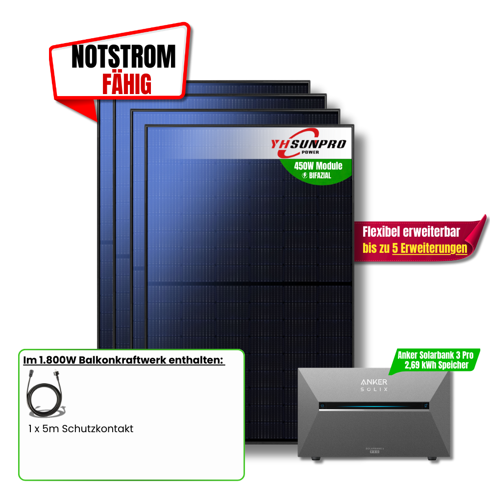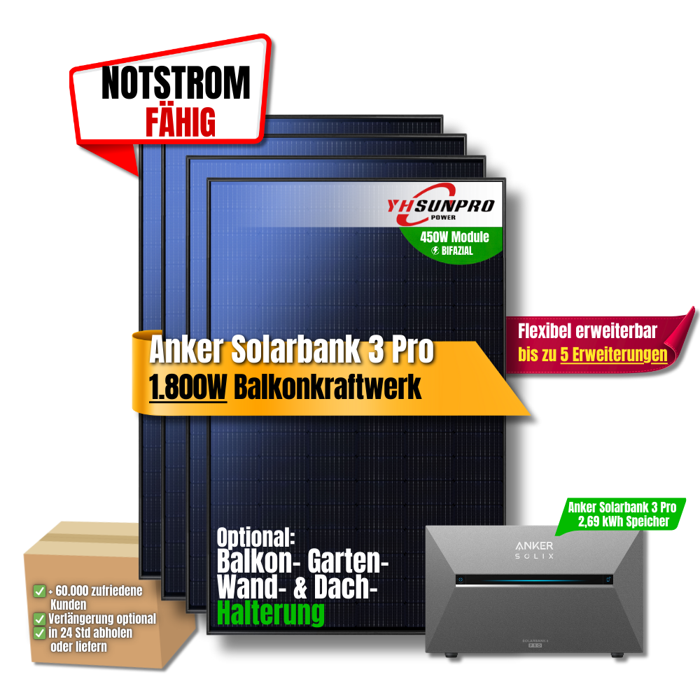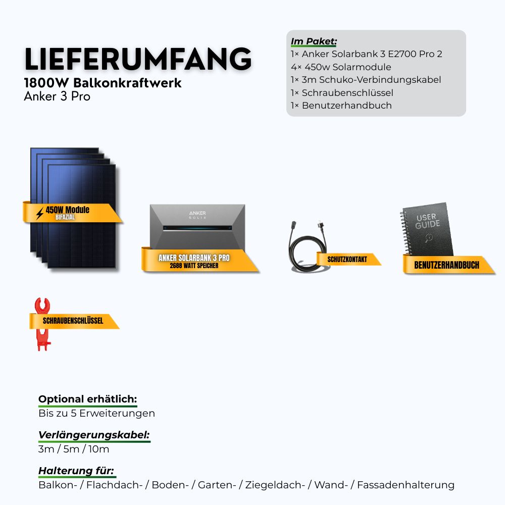 Qualität trifft auf Innovation & Leistung! Der ausgezeichnete Anker 3 Pro verbindet ein ausgeklügeltes 2,668kWh Speichersystem mit integrierten Wechselrichter. Jetzt auch mit Shelly kompatibel! Jetzt in unserem Set mit 450W Bifazialen Solarmodulen in Fullblack