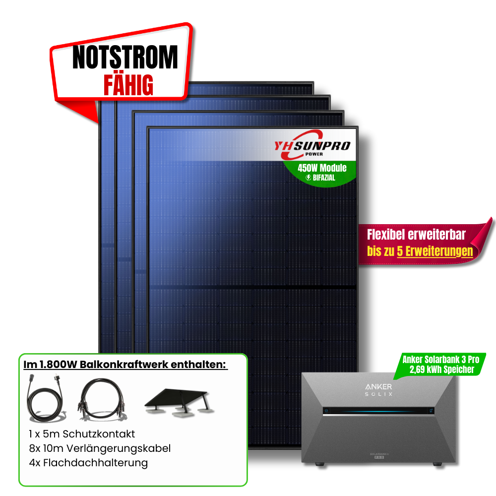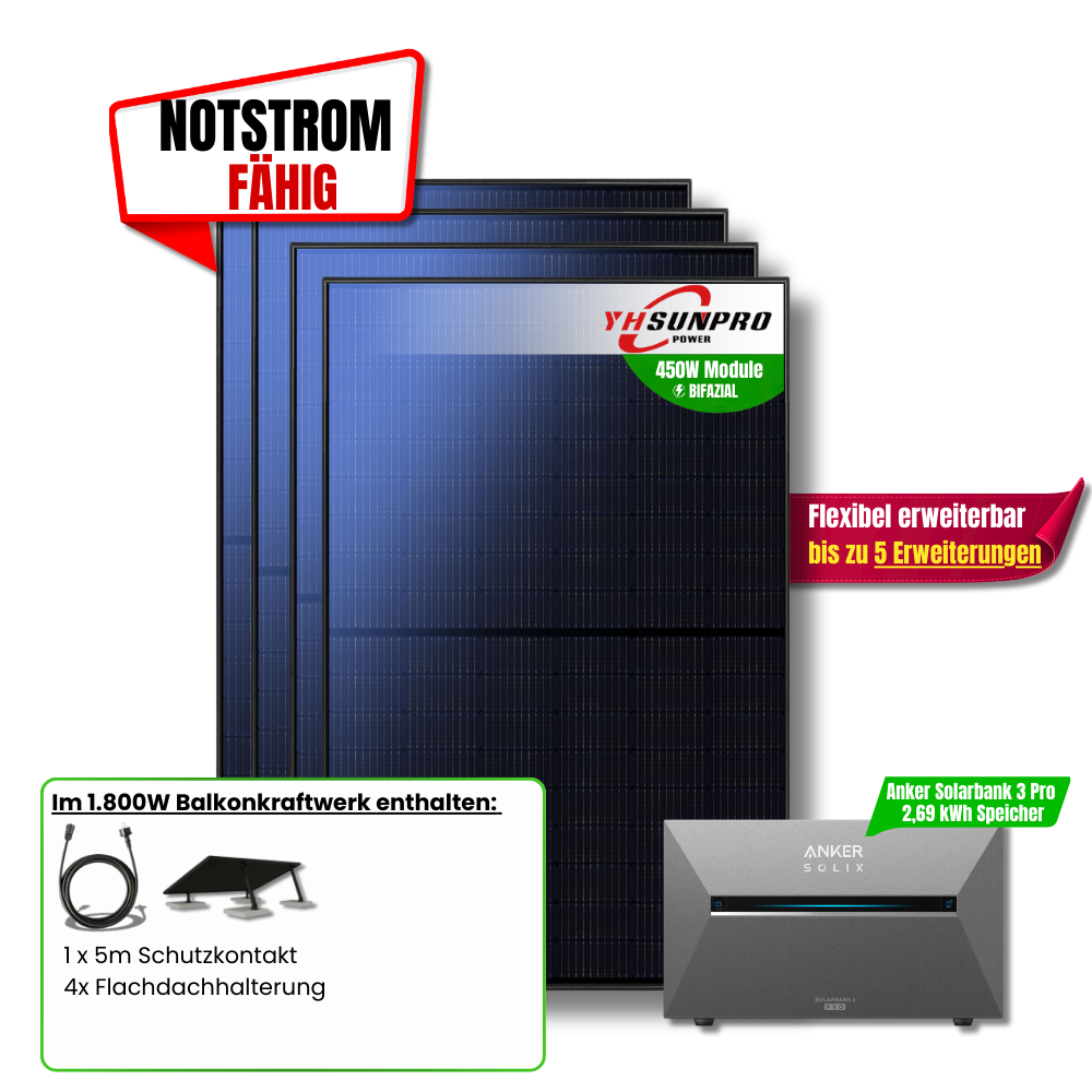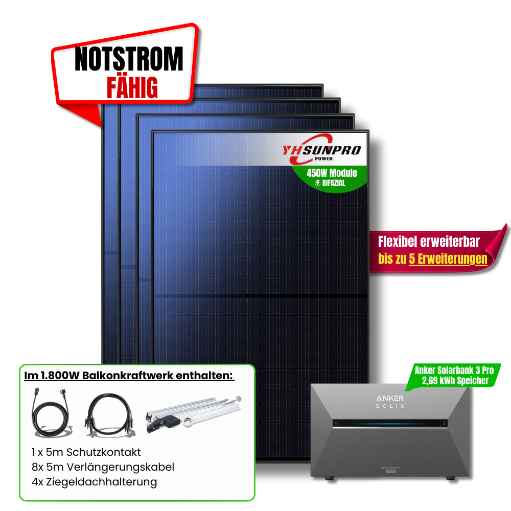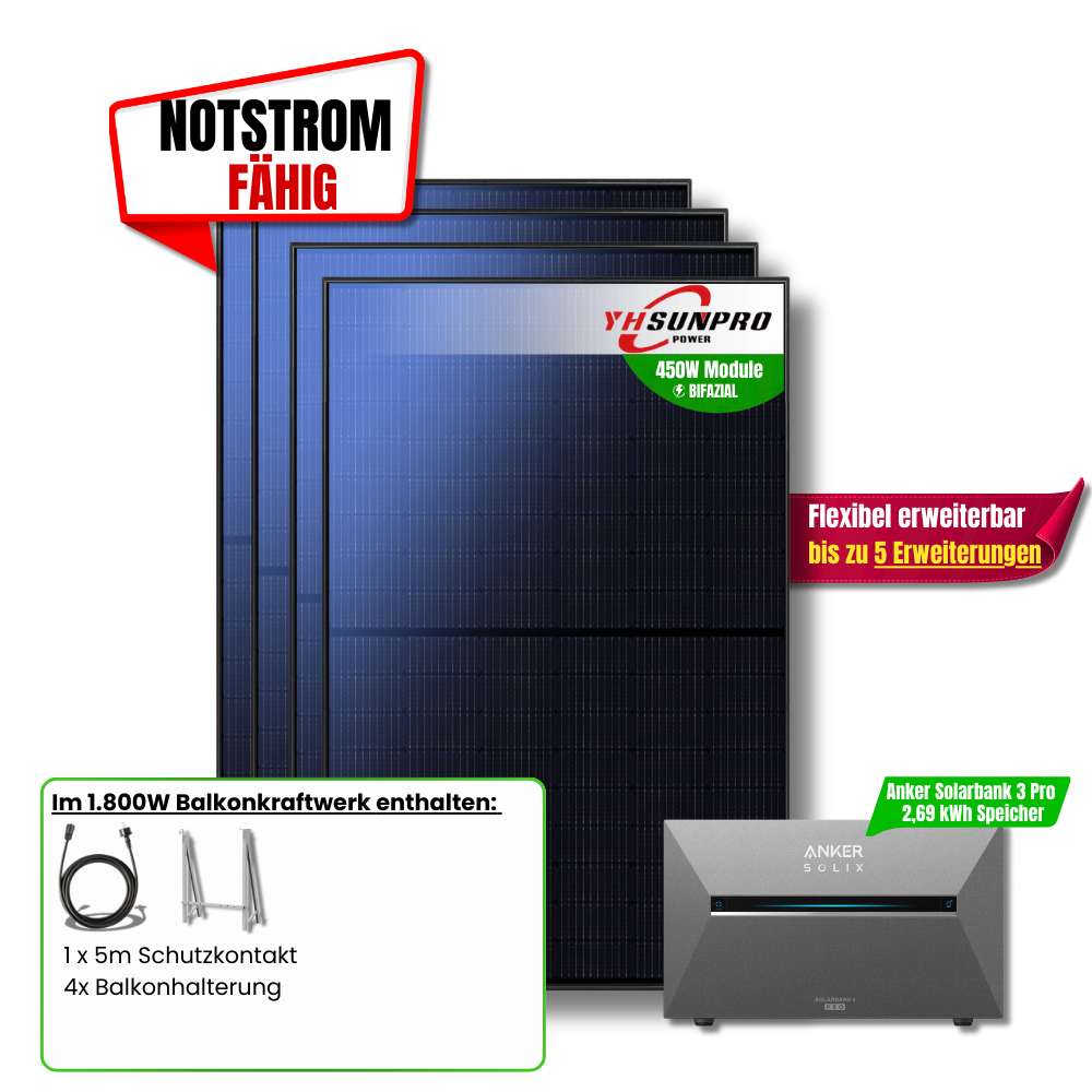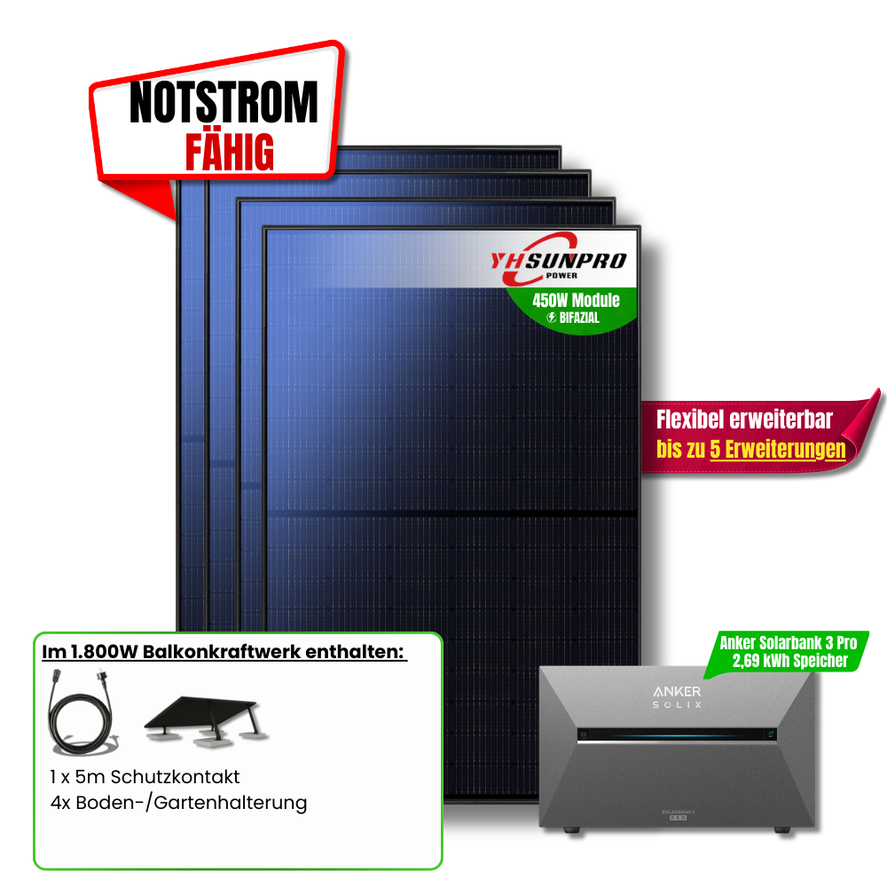 Qualität trifft auf Innovation & Leistung! Der ausgezeichnete Anker 3 Pro verbindet ein ausgeklügeltes 2,668kWh Speichersystem mit integrierten Wechselrichter. Jetzt auch mit Shelly kompatibel! Jetzt in unserem Set mit 450W Bifazialen Solarmodulen in Fullblack