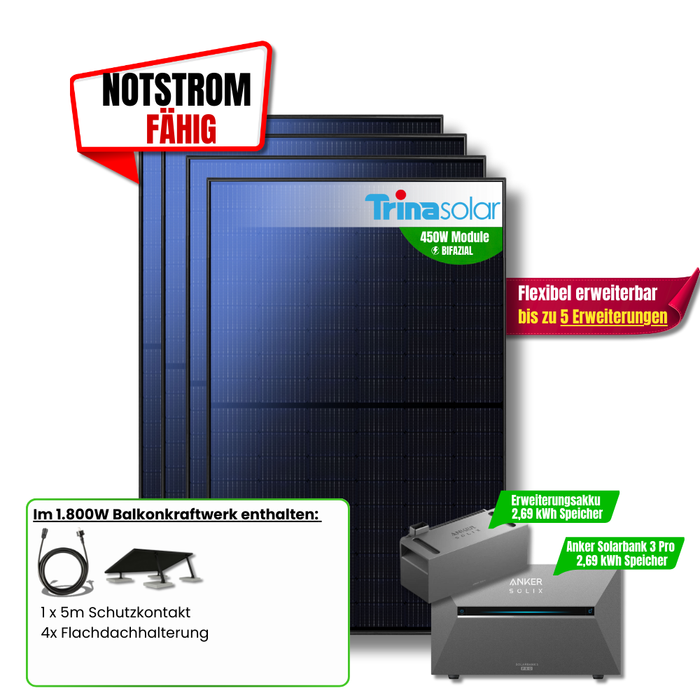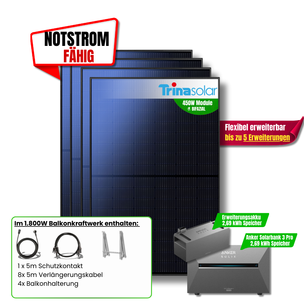 Das 1800 W Anker Pro 3 Balkonkraftwerk mit Erweiterungsakku ist die Premiumlösung für alle, die sich maximale Leistung, doppelte Speicherkapazität und Notstromsicherheit wünschen. Modular, erweiterbar und intelligent gesteuert – dieses System ist die perfekte Wahl für Haushalte, die langfristig auf Unabhängigkeit, Flexibilität und Nachhaltigkeit setzen wollen.