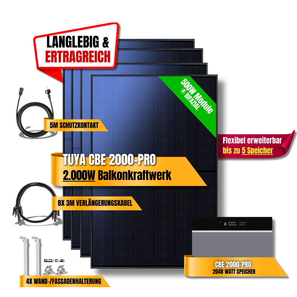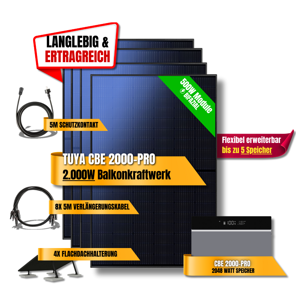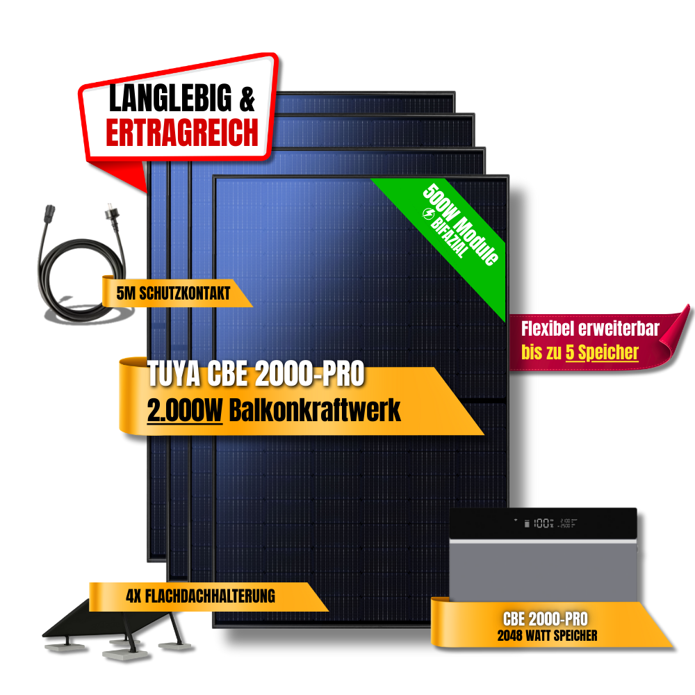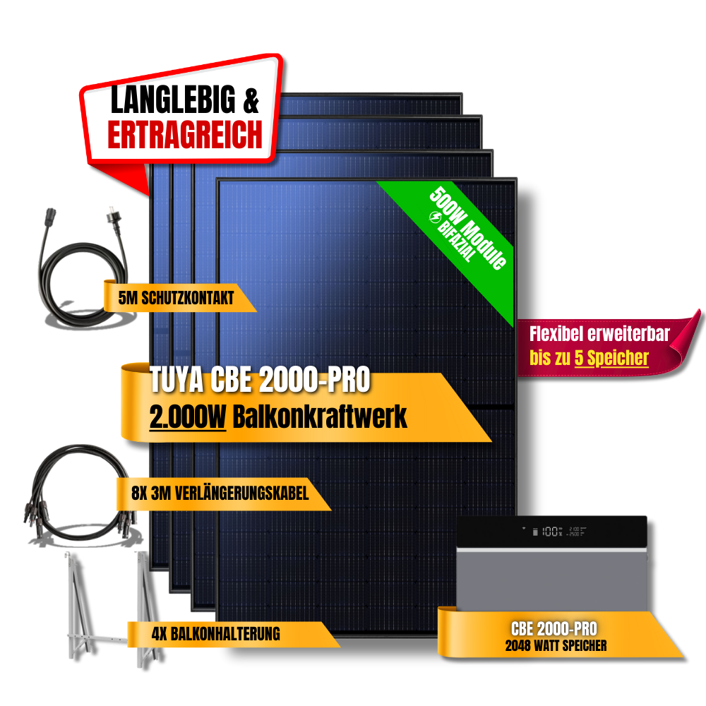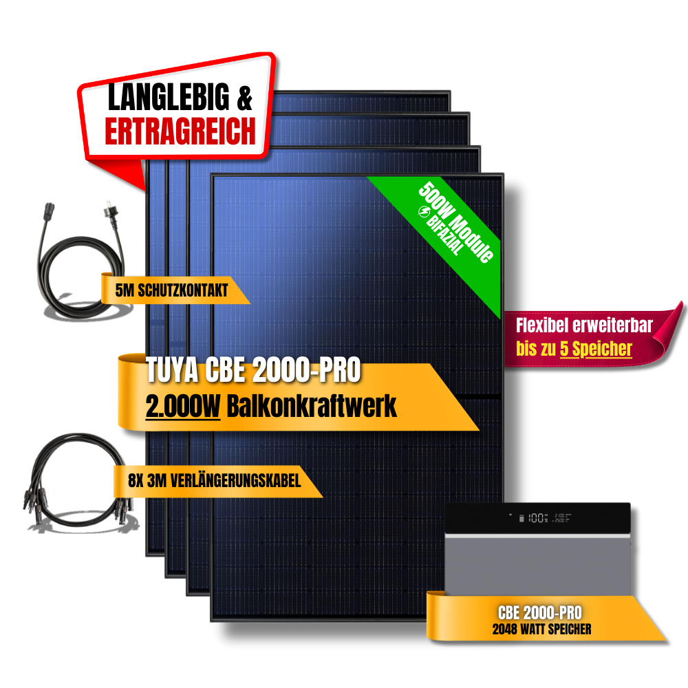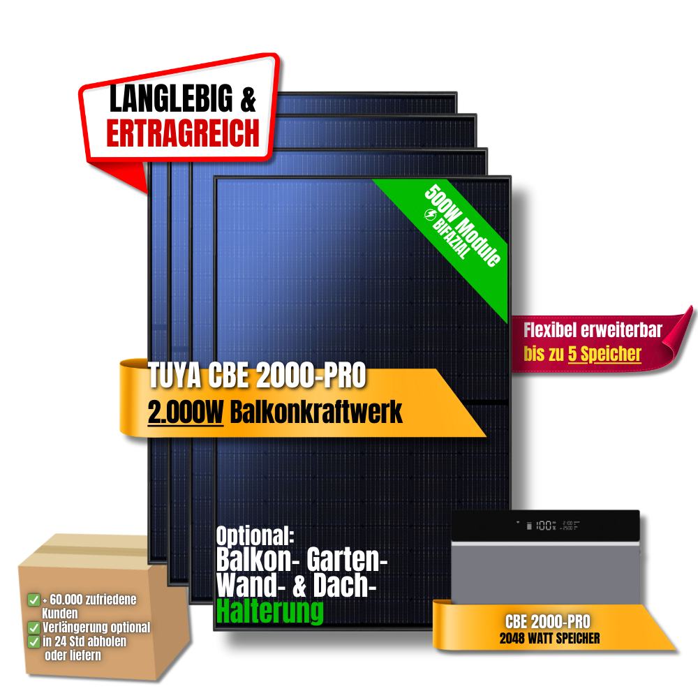 Das 2000W Tuya CBE 2000-Pro Balkonkraftwerk ist die perfekte Lösung für Haushalte, die maximale Leistung, smarte Pro-Steuerung und Zukunftssicherheit kombinieren möchten. Es steigert Autarkie, senkt Energiekosten und ist für eine langfristige Nutzung bestens vorbereitet.