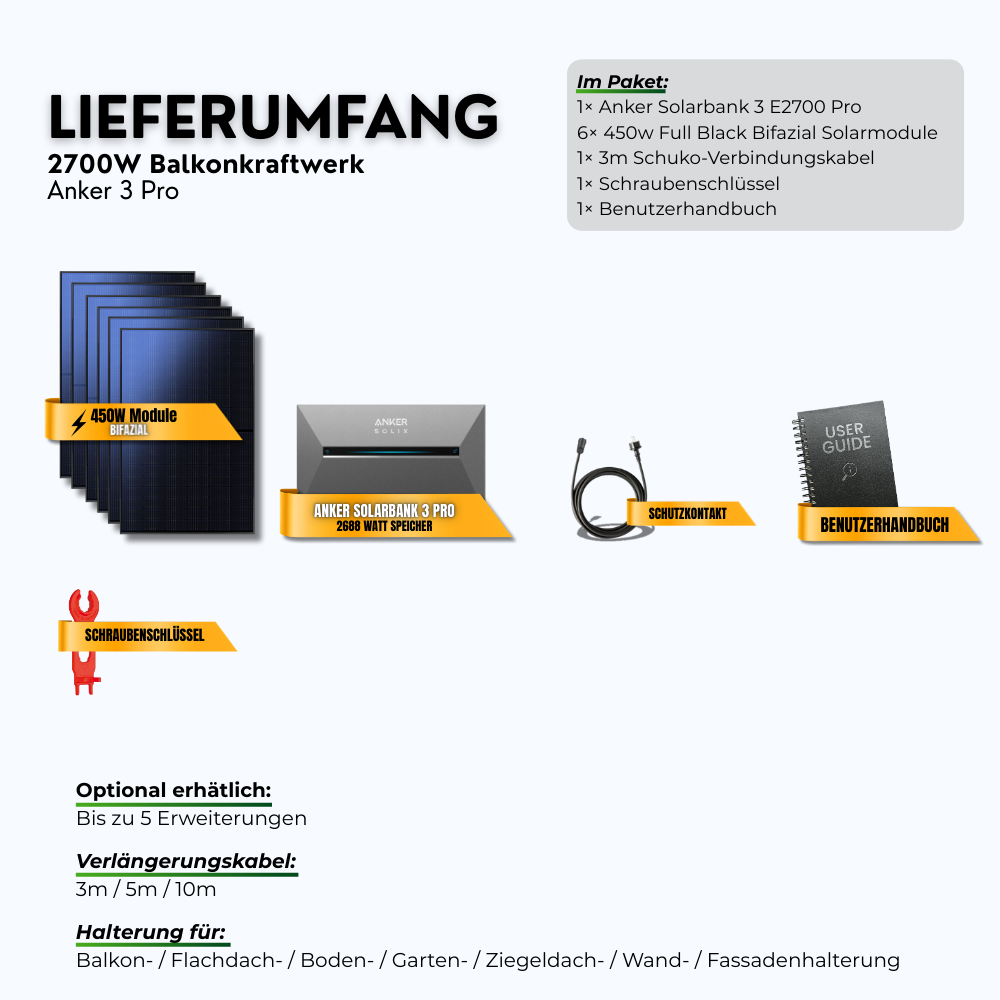 Das 2700 W Anker Pro 3 Balkonkraftwerk ist die Premiumlösung für alle, die sich maximale Leistung, hohe Basiskapazität und Notstromsicherheit wünschen. Modular, erweiterbar und intelligent gesteuert – dieses System ist die perfekte Wahl für Haushalte, die langfristig auf Unabhängigkeit, Flexibilität und Nachhaltigkeit setzen wollen.